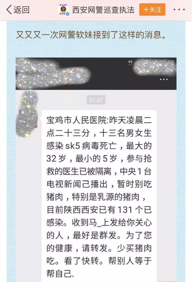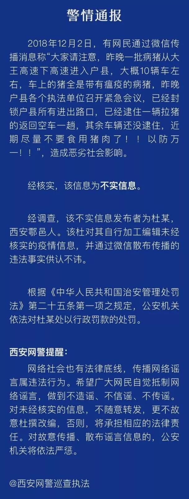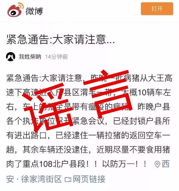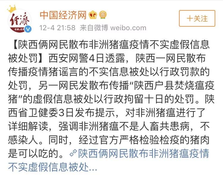 (相關(guān)鏈接:散布鄠邑“焚燒瘟疫豬”謠言 咸陽一男子被拘10日)