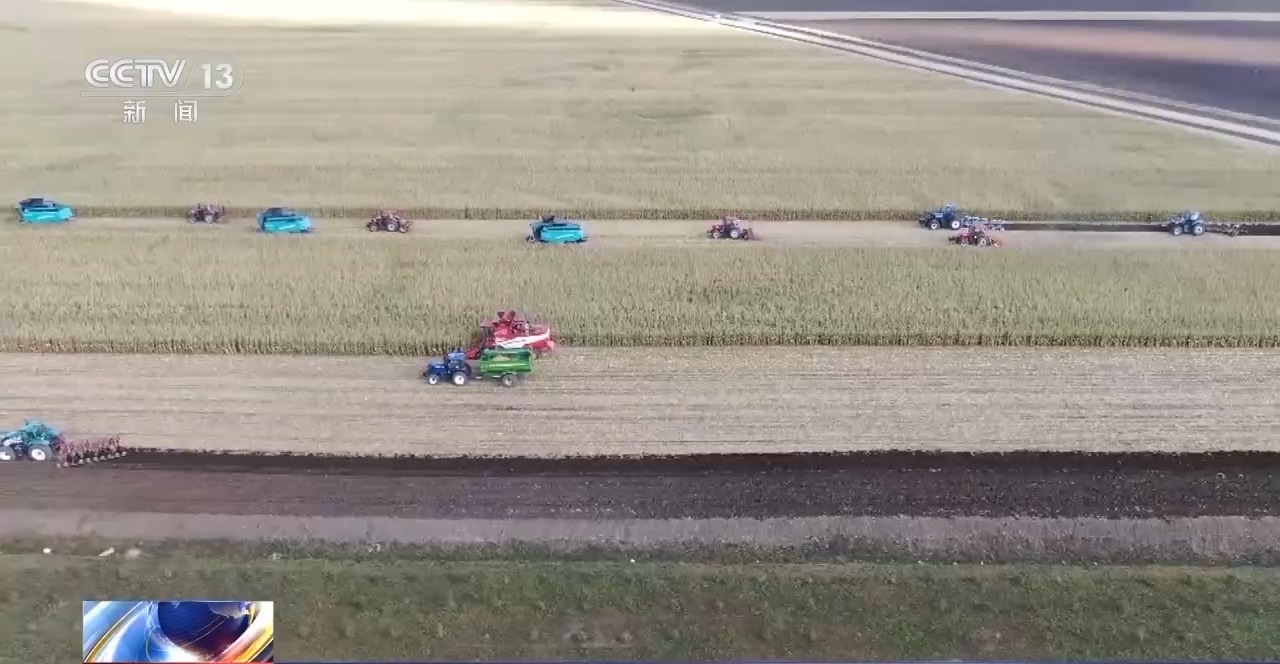 總臺(tái)央視記者 張琪:黑龍江北大荒集團(tuán)友誼農(nóng)場(chǎng)的84萬畝玉米已開鐮收獲,當(dāng)?shù)亟M織了近200臺(tái)240馬力以上的收割機(jī)正在搶收。僅僅15分鐘,一臺(tái)收割機(jī)就將8行、長(zhǎng)1800米的玉米“吞”得干干凈凈。