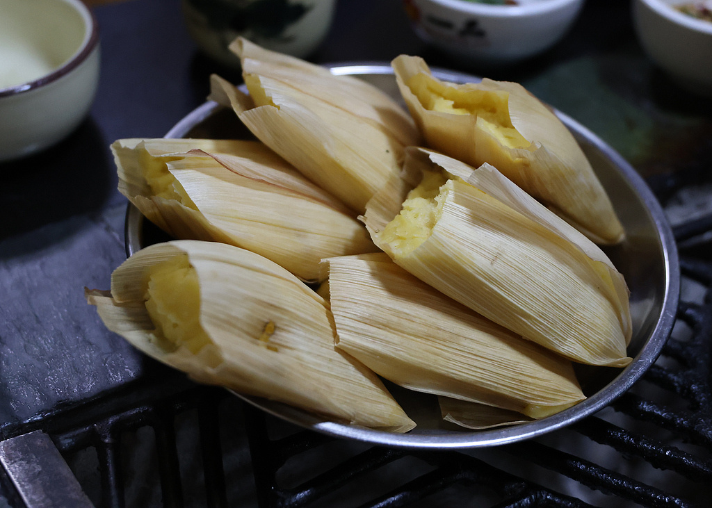西南地區(qū)的“苞谷粑粑”用嫩玉米粒磨成漿,捏成長條狀,用玉米苞葉包起來蒸熟,散發(fā)出“本是同根生”的清香,綿軟清甜。