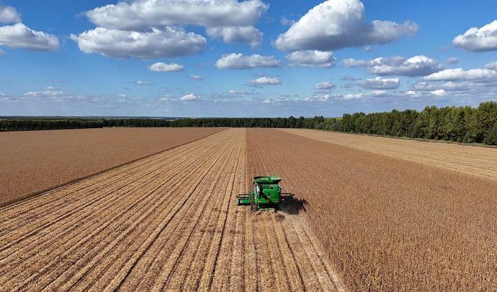 2025年9月19日,在北大荒集團黑龍江格球山農場有限公司大豆地塊,收獲機車在進行收獲作業(yè)(無人機照片)。新華社發(fā)(陸文祥攝)