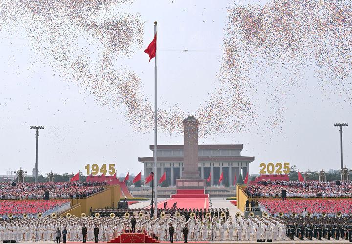 2025年9月3日,紀念中國人民抗日戰(zhàn)爭暨世界反法西斯戰(zhàn)爭勝利80周年大會在北京隆重舉行。這是紀念大會現(xiàn)場放飛氣球。新華社記者 李賀 攝