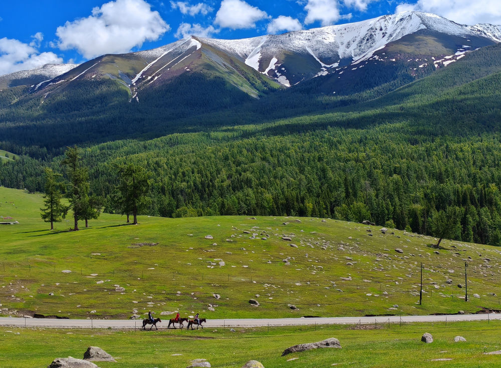 2024年6月4日,游客在新疆阿勒泰地區(qū)哈巴河縣騎馬游玩。電視劇《我的阿勒泰》播出后,新疆阿勒泰地區(qū)迎來客流高峰,“張鳳俠的小賣部”“巴太樹”“彩虹布拉克”等劇中地點(diǎn)成為熱門旅游打卡地。這場(chǎng)“邊城”與“熱劇”雙向奔赴的文旅盛宴,為當(dāng)?shù)亟?jīng)濟(jì)發(fā)展帶來新的增長(zhǎng)點(diǎn)。2024年5月,當(dāng)?shù)亟哟慰?15.03萬人次,同比增長(zhǎng)60.81%;實(shí)現(xiàn)旅游收入36.53億元,同比增長(zhǎng)88.25%。