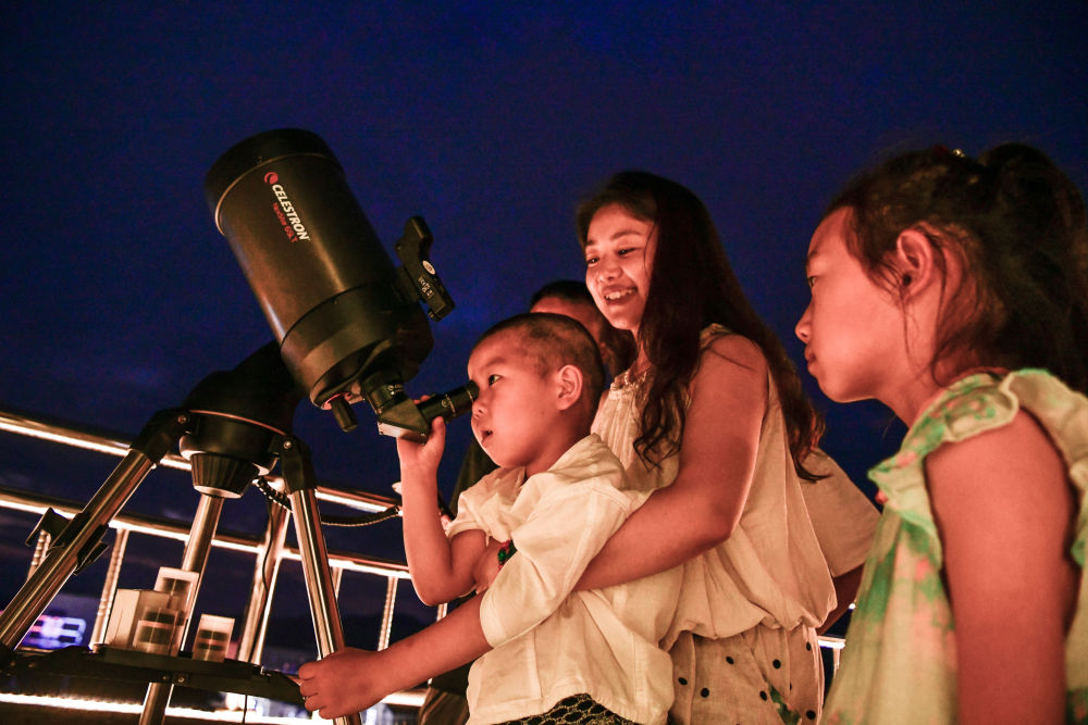 2025年7月9日,游客在貴州省平塘縣克度“天文小鎮(zhèn)”通過望遠(yuǎn)鏡觀測(cè)星空。近年來,隨著旅游設(shè)施逐漸完善,距離“中國(guó)天眼”僅8公里的克度“天文小鎮(zhèn)”通過“科普+文旅”發(fā)展模式,帶動(dòng)村民就業(yè)創(chuàng)業(yè)、增收致富。2025年1月至6月,“中國(guó)天眼”景區(qū)共接待游客約38萬人次,總收入2496萬余元。