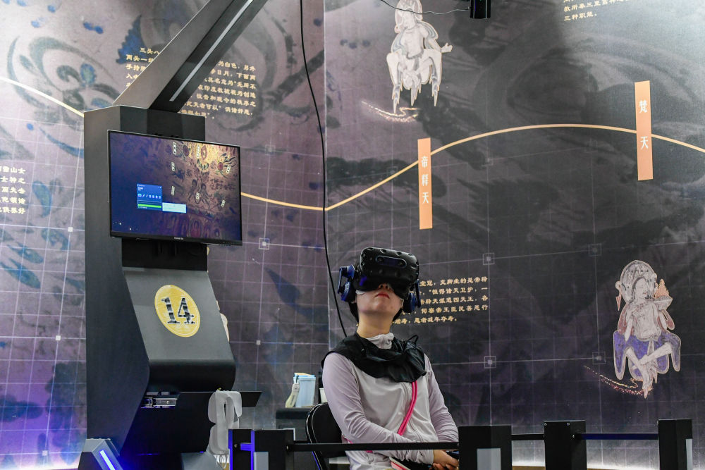 2024年7月22日,游客在“尋境敦煌——數(shù)字敦煌沉浸展”借助VR設(shè)備沉浸式游覽莫高窟第285窟虛擬場(chǎng)景?!皩ぞ扯鼗汀獢?shù)字敦煌沉浸展”綜合運(yùn)用VR虛擬現(xiàn)實(shí)、三維建模、游戲引擎的物理渲染和全局動(dòng)態(tài)光照等新技術(shù),高精度立體還原了莫高窟第285窟。游客戴上VR眼鏡,不僅可以零距離觀賞壁畫、360度自由探索洞窟細(xì)節(jié),還能“飛升”到窟頂,身臨其境參與壁畫故事情節(jié),沉浸式感受敦煌文化的魅力。
