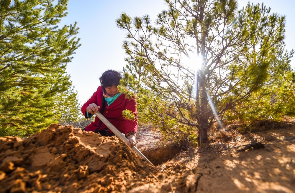 2021年3月23日,殷玉珍在內(nèi)蒙古毛烏素沙漠挖土,查看松樹根部的生長情況。20世紀(jì)80年代,殷玉珍嫁到這片沙地時(shí),眼前只有漫無邊際的黃沙。1986年,她埋下第一棵樹苗,從此與風(fēng)沙較勁。如今,7萬多畝荒沙披上了綠裝,治理好的土地上種起了小米,金燦燦的谷穗成了“沙漠黃金”。