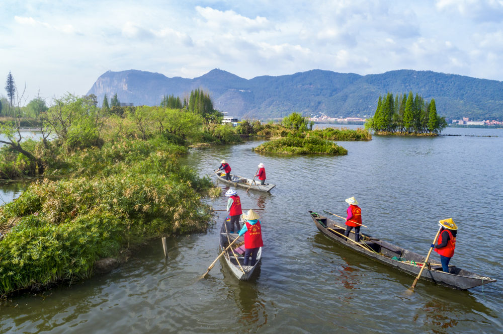 2023年3月20日,巾幗打撈隊(duì)隊(duì)員在云南昆明滇池草海打撈水草(無人機(jī)照片)。在云南昆明滇池邊,活躍著一支由當(dāng)?shù)貗D女組成的巾幗打撈隊(duì)。數(shù)十年來,她們駕駛船只打撈滇池及周邊入湖河道、濕地的垃圾、雜草等。