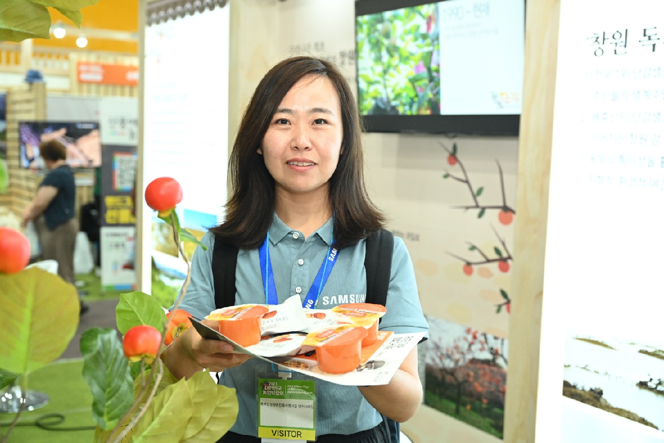 “村帶頭人訪韓”活動期間,楊維娜參觀農(nóng)博會柿子深加工產(chǎn)品