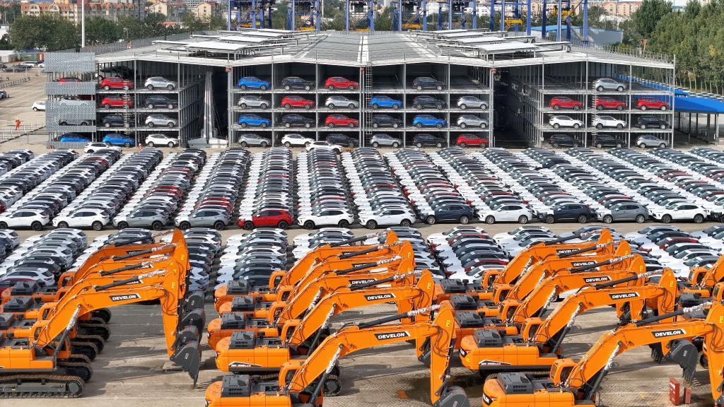 △山東港口煙臺(tái)港,國(guó)產(chǎn)汽車(chē)和工程機(jī)械集結(jié)等待裝船出口。