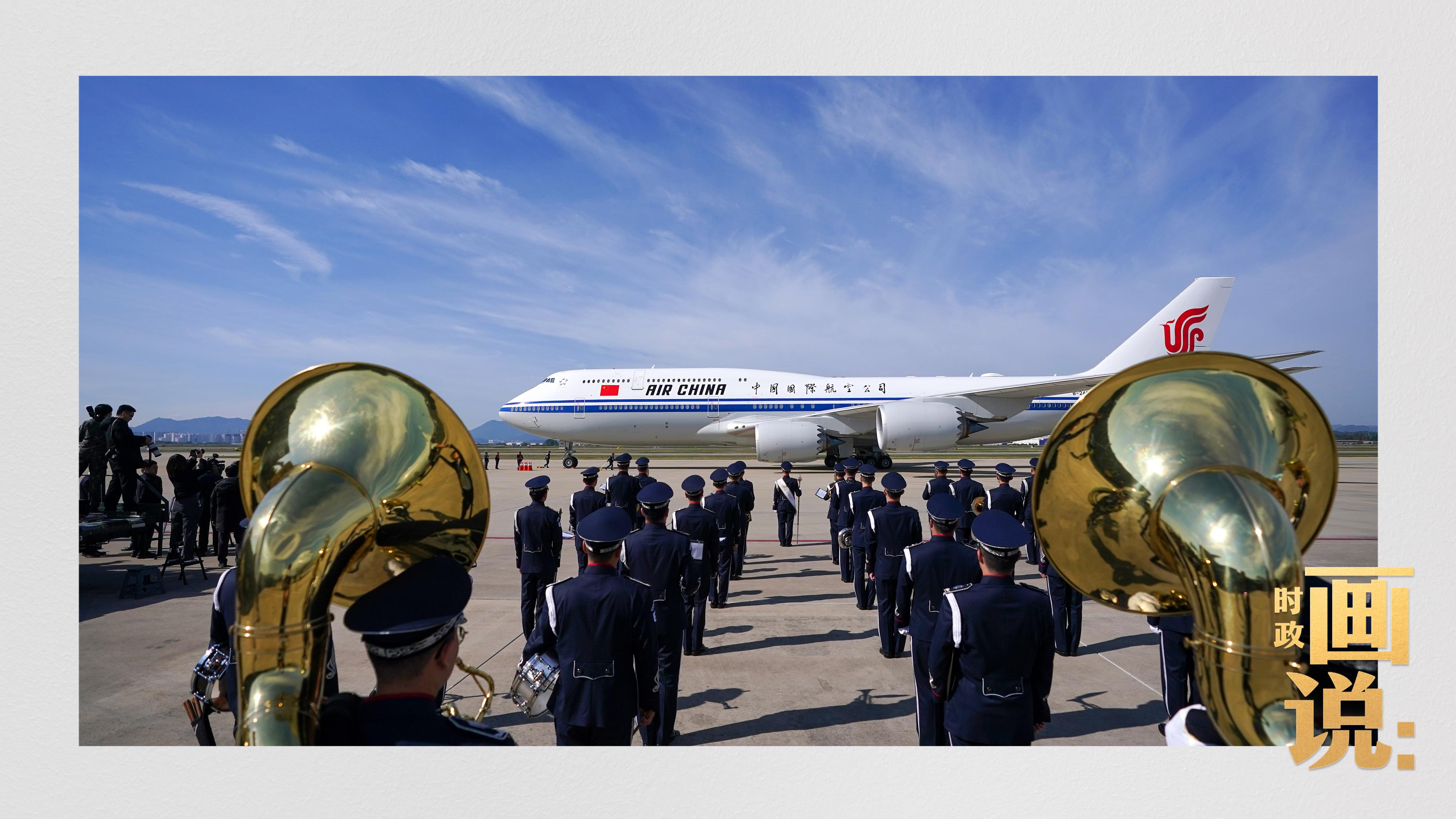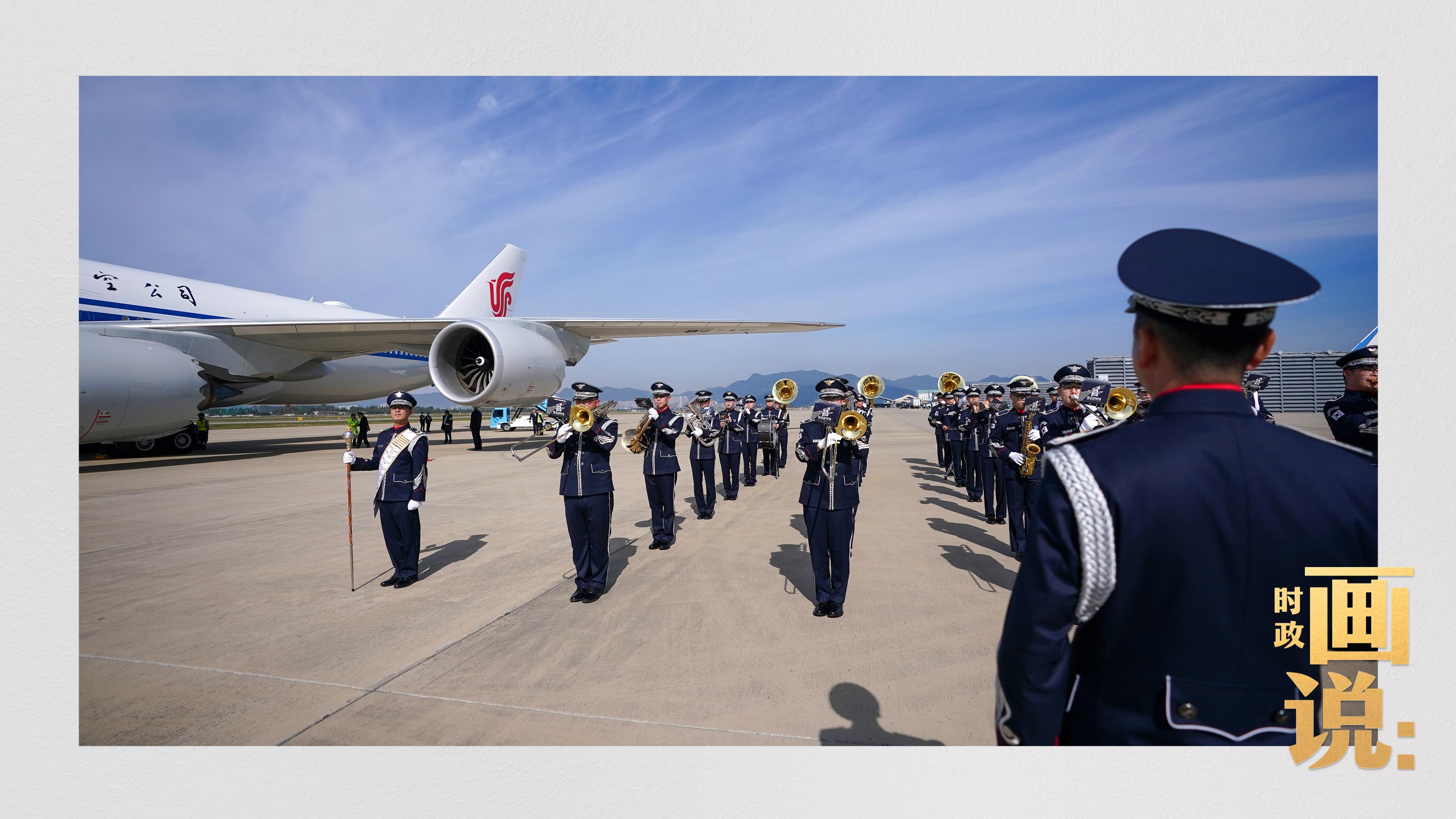 習(xí)近平抵達(dá)釜山金海國(guó)際機(jī)場(chǎng)時(shí),韓國(guó)外長(zhǎng)趙顯等高級(jí)官員熱情迎接。禮兵分列紅地毯兩側(cè)致敬,軍樂(lè)團(tuán)演奏行進(jìn)樂(lè),機(jī)場(chǎng)鳴放21響禮炮。