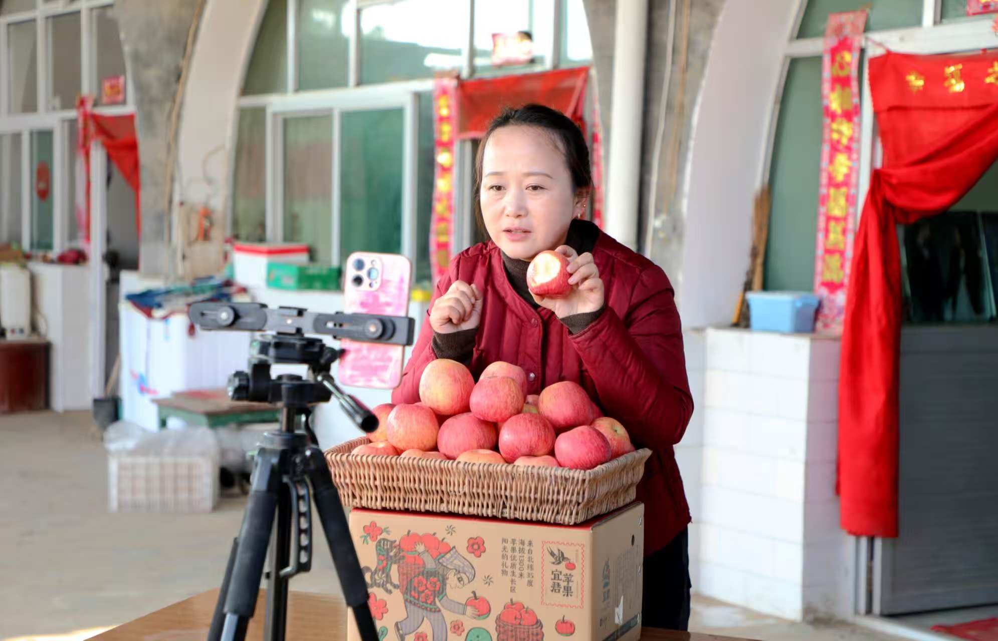 “哈嘍,寶寶們,歡迎家人們來(lái)到直播間!快看,我們宜君蘋(píng)果咬一口,脆甜多汁,瞧瞧這色澤,是原產(chǎn)地土生土長(zhǎng)的味道?!?6歲的問(wèn)艷麗身穿紅色棉襖,站在宜君縣堯生鎮(zhèn)孟皇村自家院子的三孔窯洞前,面對(duì)直播鏡頭侃侃而談。