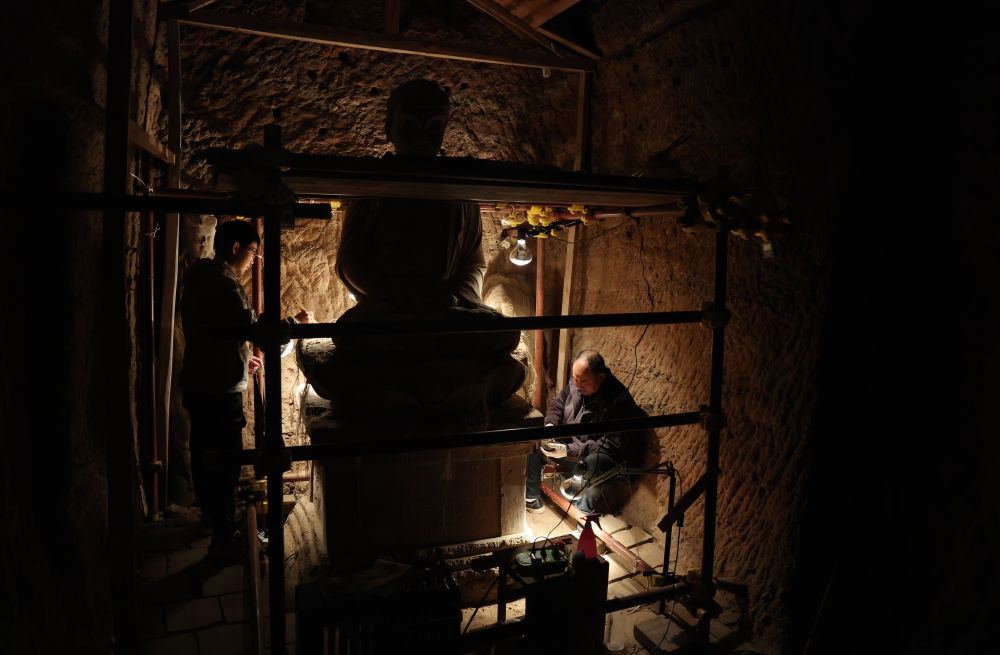 2024年11月2日,麥積山石窟藝術(shù)研究所保護(hù)研究室的高級文物修復(fù)師牟常有(右)和徒弟何舉在麥積山石窟133窟內(nèi)修復(fù)塑像。自1985年至今,牟常有在麥積山石窟藝術(shù)研究所工作已有四十年。經(jīng)過多年磨礪,牟常有的文物修復(fù)技藝日臻成熟,面對年輕人的請教,他更是傾囊相授?!八芟癖诋嫿允悄痰臍v史,守護(hù)它們,需要耐心和毅力,相信年輕人能夠接好接力棒,讓這份珍貴的人類文化遺產(chǎn)永續(xù)?!蹦渤S姓f。