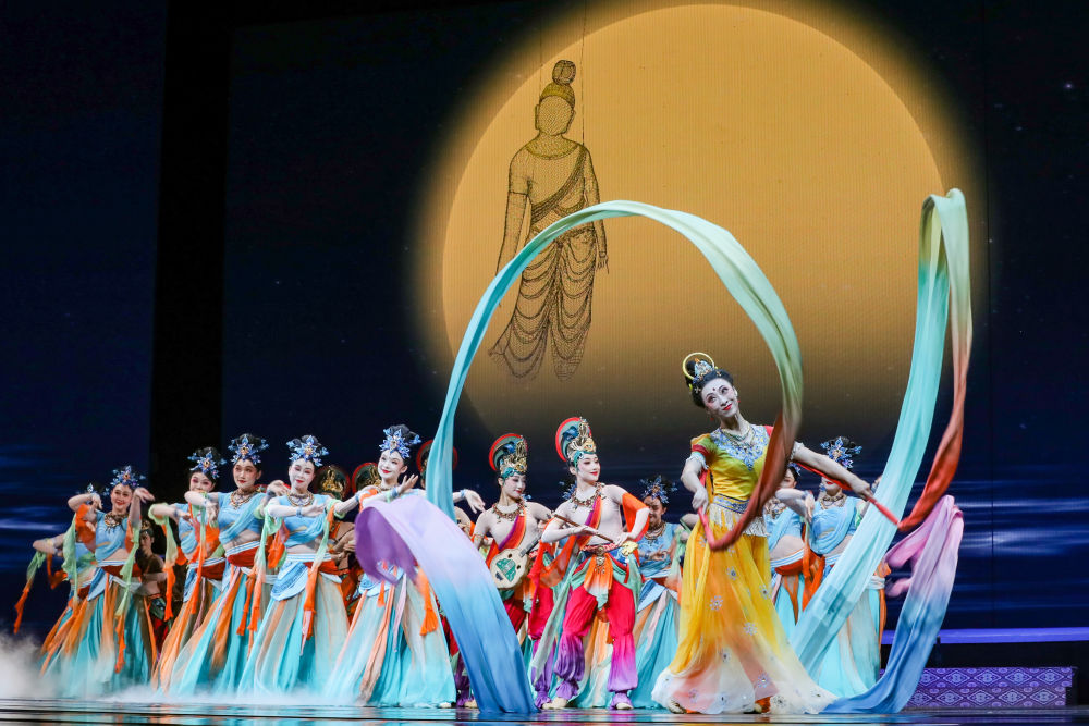 2025年9月22日,在敦煌舉辦的“相約敦煌”國際文化交流演出活動上,甘肅省演藝集團(tuán)的演員展演《樂動敦煌》選段?!稑穭佣鼗汀方柚鷮δ呖弑诋嫛⒉亟?jīng)洞古籍的解讀梳理,活化敦煌古樂器、古樂譜研發(fā)成果,通過全息投影等手段,結(jié)合專業(yè)演員的表演,將莫高窟壁畫中的樂舞盛景生動再現(xiàn),讓觀眾沉浸式感悟傳承千年的敦煌樂舞文化魅力。
