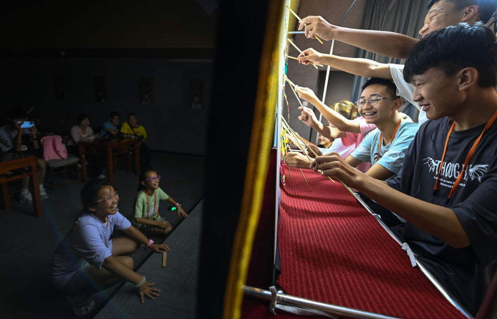 2023年8月8日,進(jìn)行暑期研學(xué)的學(xué)生在位于西安的中國(guó)秦腔藝術(shù)博物館里體驗(yàn)皮影戲演出。