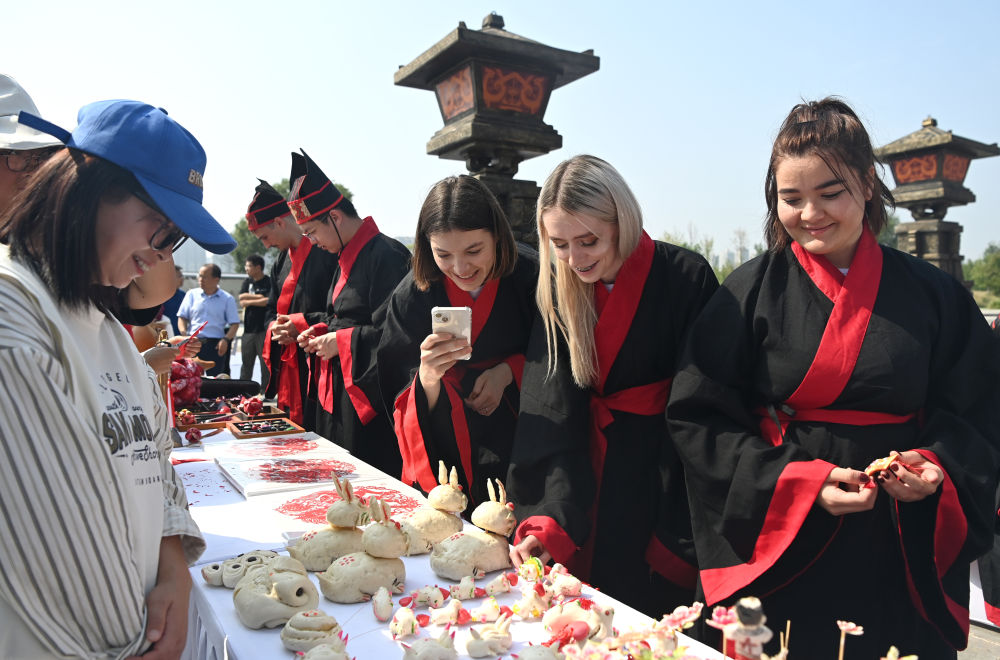 2023年9月16日,“絲路起點(diǎn) 文明根脈”2023西安絲路留學(xué)生交流活動(dòng)在西安啟動(dòng),來(lái)自西安交通大學(xué)的百名中外大學(xué)生著漢服、行漢禮,通過(guò)沉浸式體驗(yàn),了解中國(guó)傳統(tǒng)文化。這是中外大學(xué)生在交流活動(dòng)上了解陜西非遺。