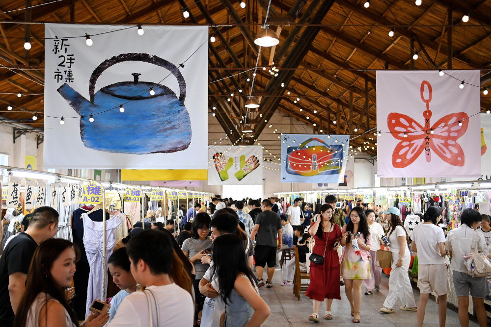 2025年7月5日,游客在西安西倉(cāng)市集文創(chuàng)公園內(nèi)的“新二手市集”上參觀游覽。2024年以來(lái),西安對(duì)西倉(cāng)區(qū)域?qū)嵤拔⒏隆⑤p改造”,在保留核心區(qū)傳統(tǒng)集市風(fēng)貌的基礎(chǔ)上,升級(jí)改造原有設(shè)施,建設(shè)西倉(cāng)市集文創(chuàng)公園,打造“復(fù)合型文化消費(fèi)新場(chǎng)景”;通過(guò)引入創(chuàng)新業(yè)態(tài)、開(kāi)設(shè)“新二手市集”等方式,讓咖啡潮玩、非遺體驗(yàn)、城市記憶展覽等年輕化元素與市井煙火相融共生,使老城核心區(qū)在“微更新”中持續(xù)煥發(fā)新活力。