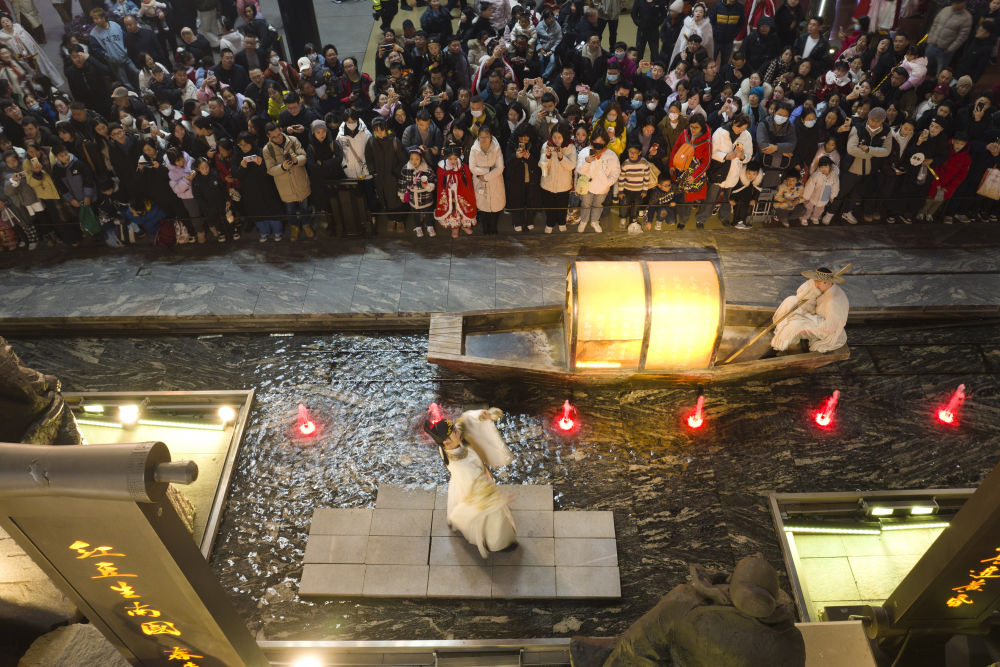 游客在西安大唐不夜城景區(qū)觀看以唐代歷史文化為背景創(chuàng)作的情景劇(無(wú)人機(jī)照片,2025年1月22日攝)。