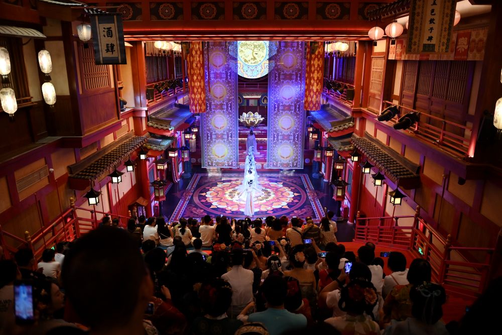 2024年5月12日,游客在西安長(zhǎng)安十二時(shí)辰主題街區(qū)內(nèi)觀看演出。街區(qū)通過(guò)漢服旅拍、演藝互動(dòng)、非遺體驗(yàn)等項(xiàng)目,讓游客“穿越”回盛唐長(zhǎng)安,為游客打造科技感、文化味十足的游歷體驗(yàn)。