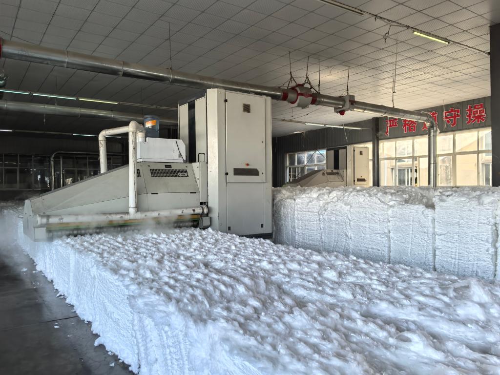 在生產(chǎn)車間,往復(fù)式抓棉機(jī)正在“吞吐”物料。新華社記者 田中全 攝