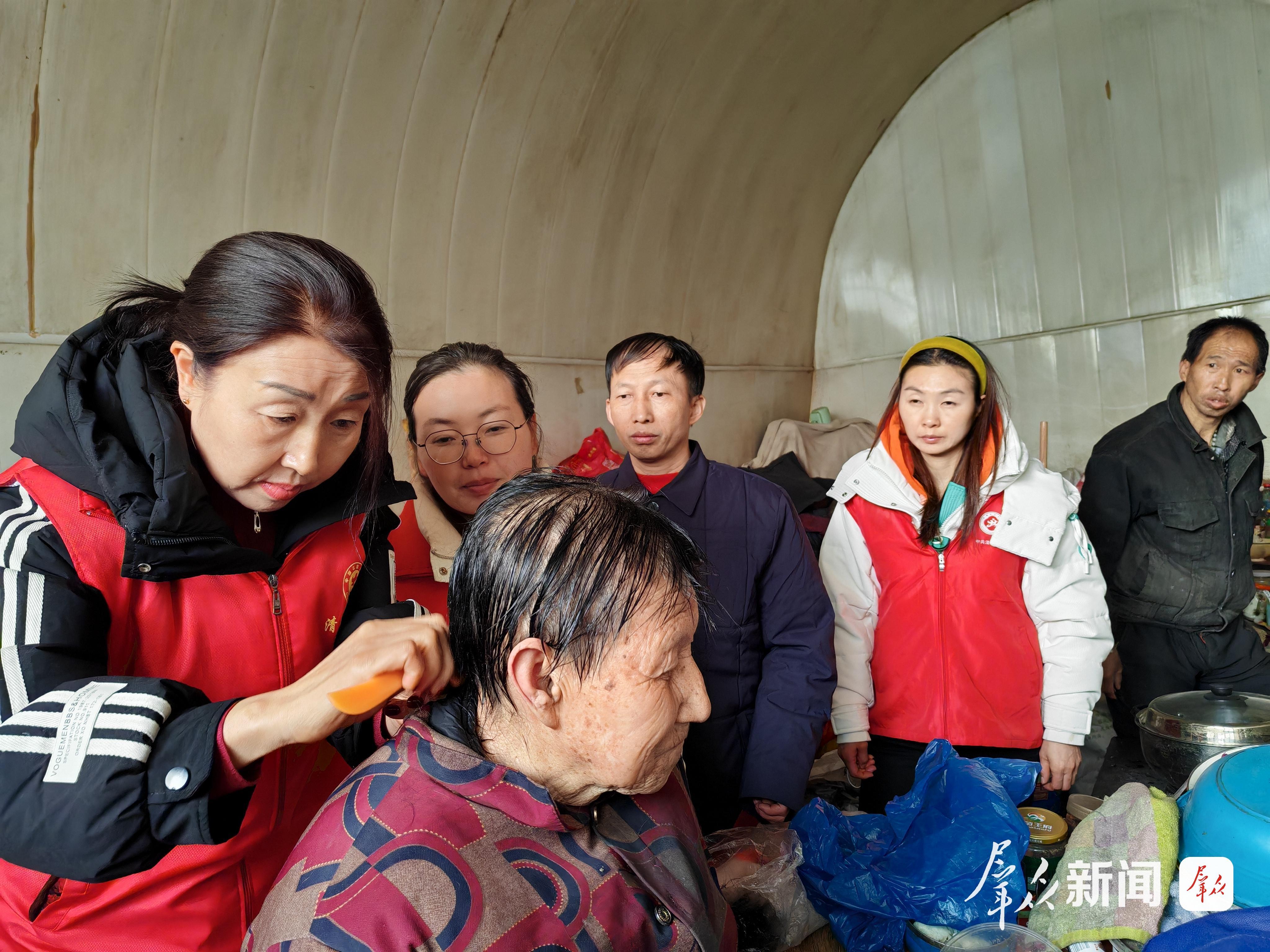 在租住于此的獨(dú)居老人白玉英家中,志愿者送來了嶄新的棉被、棉衣、洗發(fā)水和電子血壓計(jì),并現(xiàn)場為老人洗頭、理發(fā)、測量血壓。老人坐在炕上,從頭到尾笑意盈盈,連聲感嘆:“現(xiàn)在的社會真好!”還要留志愿者在她家吃肉。
