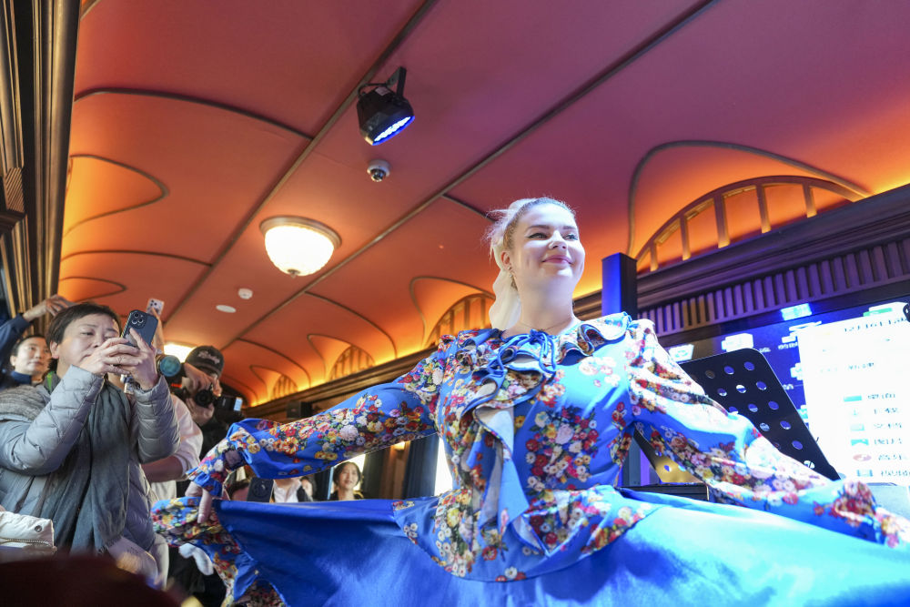 2025年12月6日,演員在黑龍江省“伊春號”旅游專列車廂中表演。當(dāng)日,“伊春號”旅游專列投入試運行,40余名受邀體驗的游客乘專列由哈爾濱站出發(fā),去往亞布力滑雪旅游度假區(qū)。2025年以來,中國鐵路哈爾濱局集團(tuán)有限公司陸續(xù)開行了多趟旅游列車,將特色體驗、民俗展示、定制化服務(wù)等進(jìn)行融合,滿足游客需求,服務(wù)旅客出行。