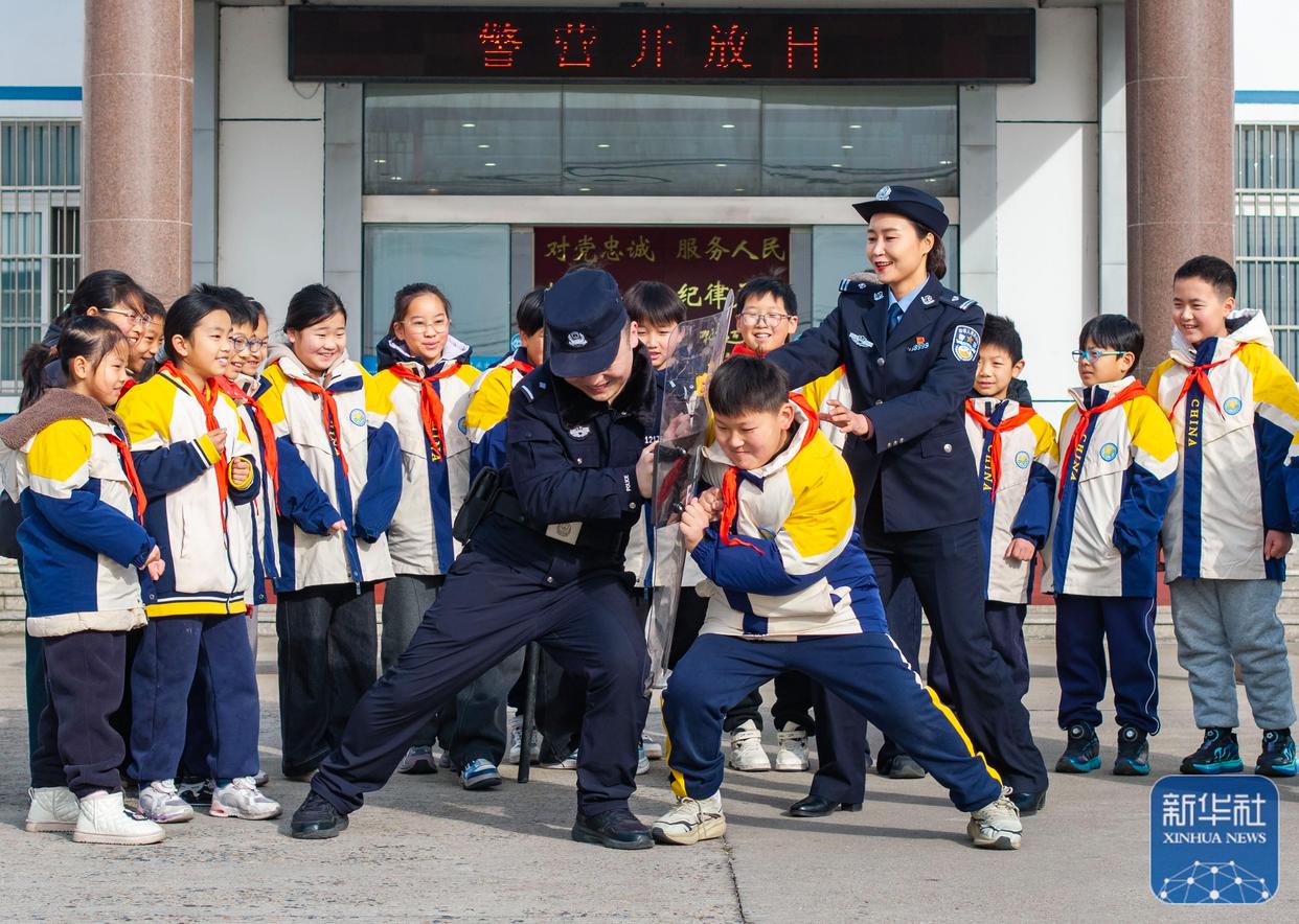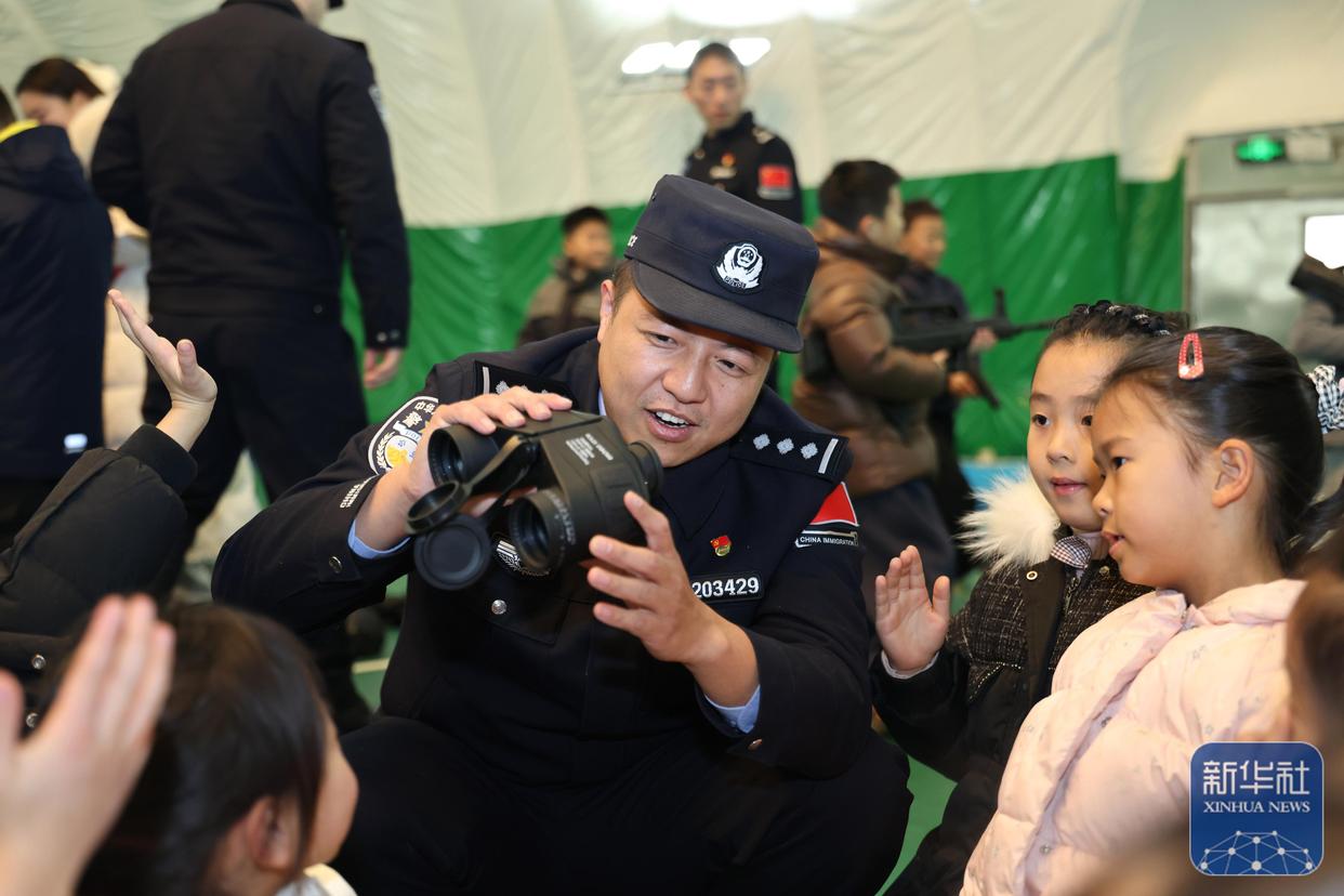 ↑ 1月10日,在江蘇淮安出入境邊防檢查站,民警給小朋友講解警用裝備使用知識。新華社發(fā)(殷潮攝)