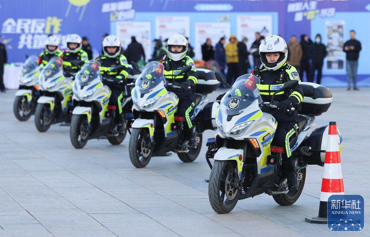 ↑ 1月10日,在河北省石家莊市舉辦的“中國人民警察節(jié)”主題活動中,騎警進(jìn)行摩托車技能展示。新華社發(fā)(梁子棟攝)