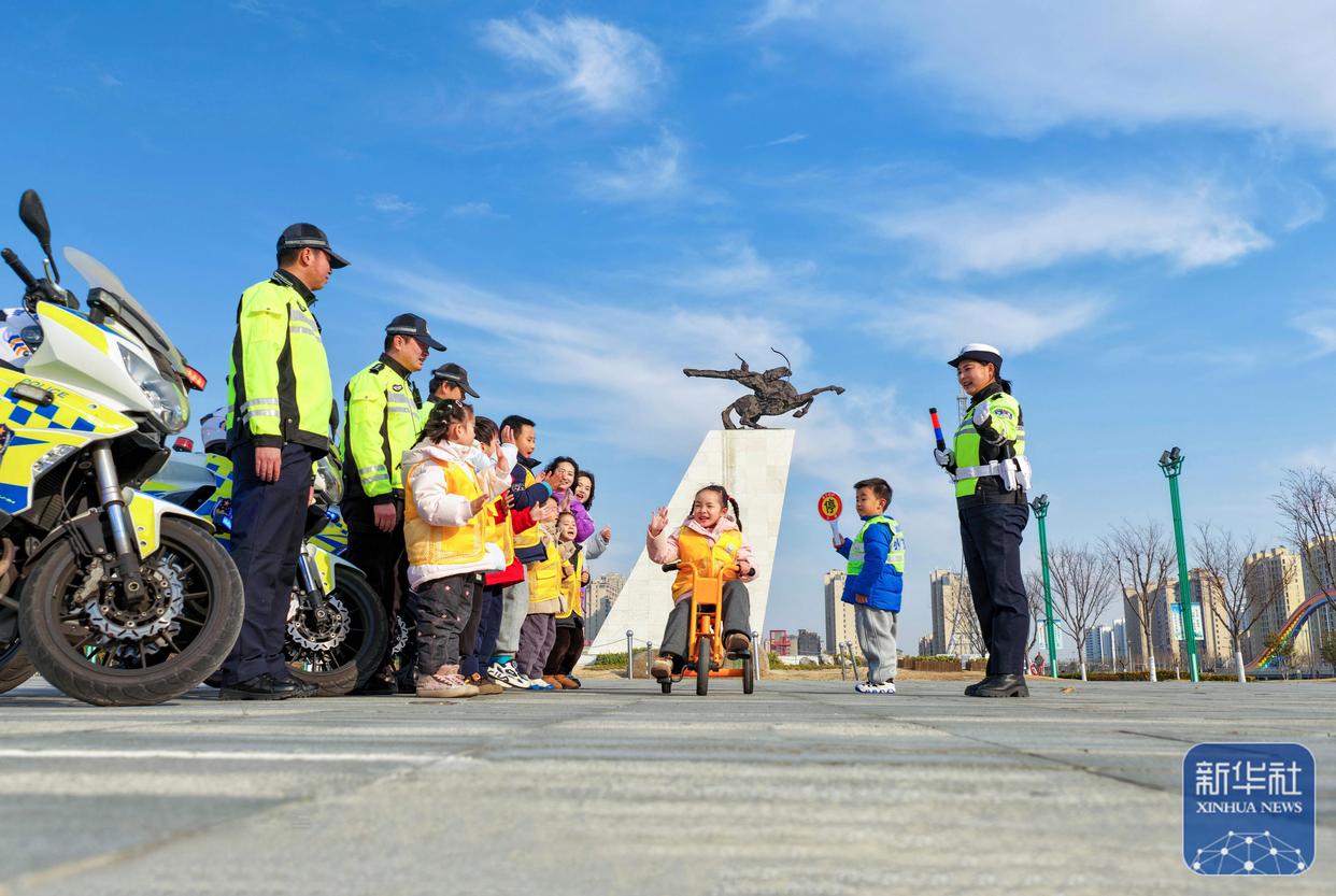 ↑ 1月10日,在江蘇省興化市昭陽湖公園,興化市公安局交警與興化市昭陽湖幼兒園的小朋友們進(jìn)行交通安全情景模擬游戲互動(無人機(jī)照片)。新華社發(fā)(周社根攝)