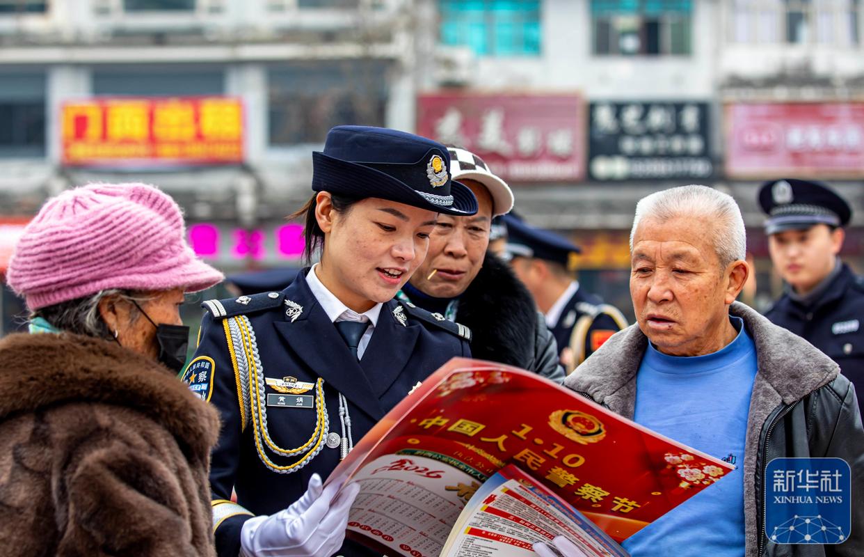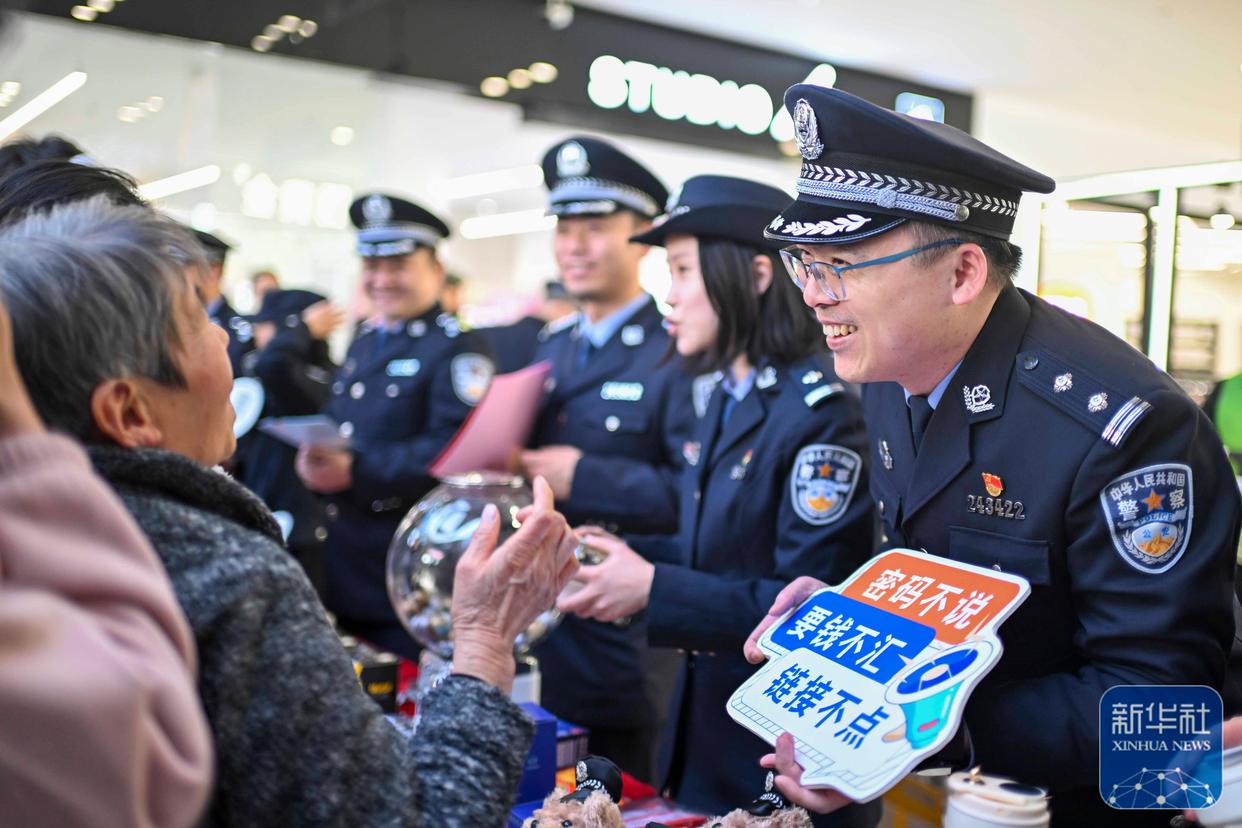 ↑ 1月10日,警察在貴州省黔西市水西廣場為市民宣傳防電信詐騙知識。新華社發(fā)(范暉攝)