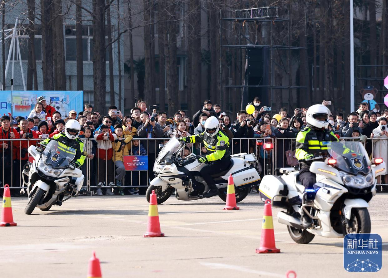 ↑ 1月10日,武漢交警漢警快騎在警營開放日活動現(xiàn)場為市民展示警務(wù)騎行技能。新華社發(fā)(趙軍攝)