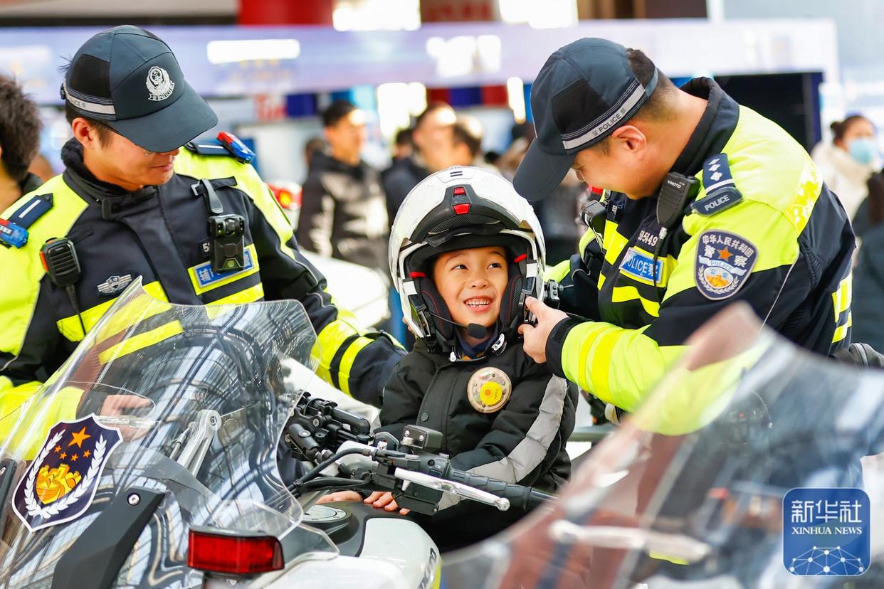 ↑ 1月10日,在武漢市公安局警營開放日活動現(xiàn)場,小朋友在民警指導(dǎo)下體驗警用裝備。新華社發(fā)(趙軍攝)