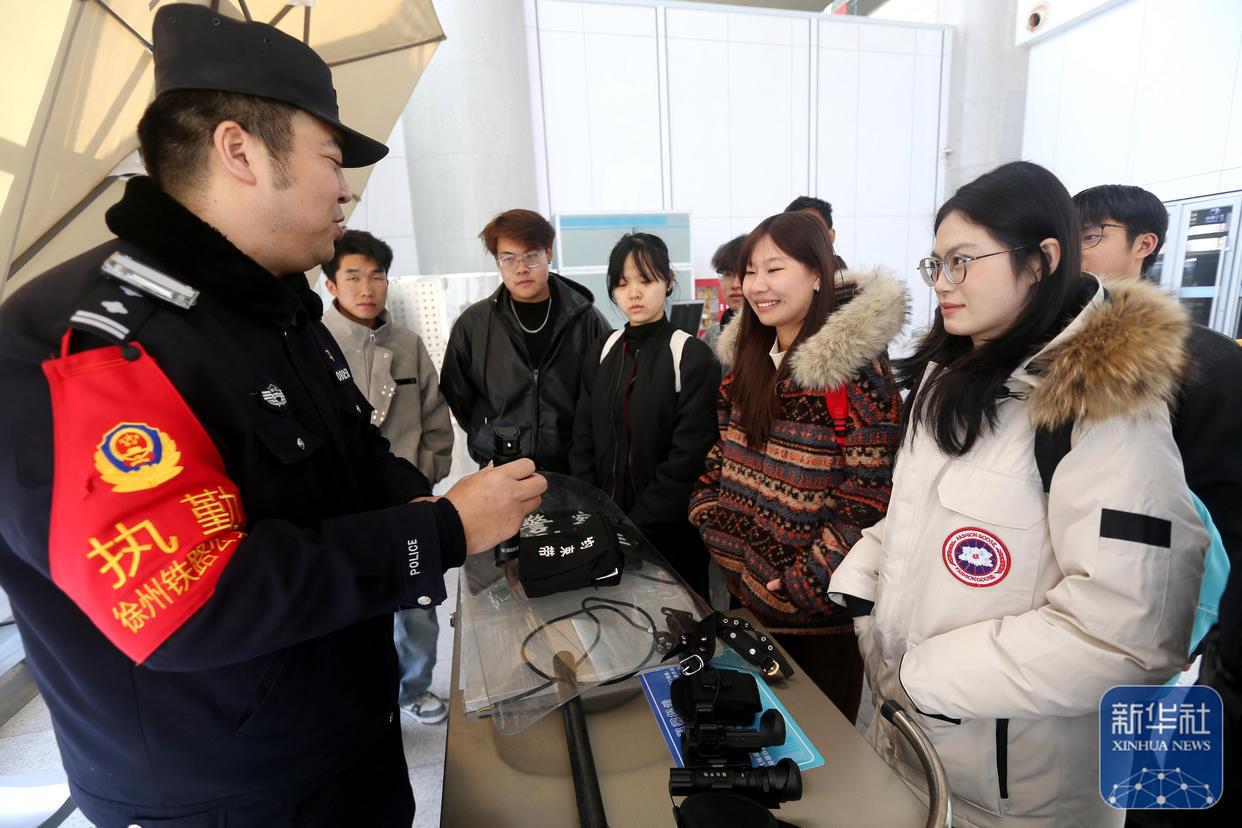 ↑ 1月10日,在上海鐵路公安局徐州鐵路公安處連云港東站派出所舉行的“相約110 與警同行”活動中,民警為旅客介紹警用裝備。新華社發(fā)(王春攝)