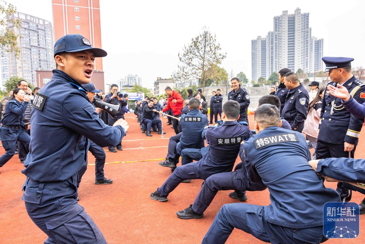 ↑ 1月10日,警察在貴州省安順市公安局參加拔河比賽。新華社發(fā)(陳熙攝)