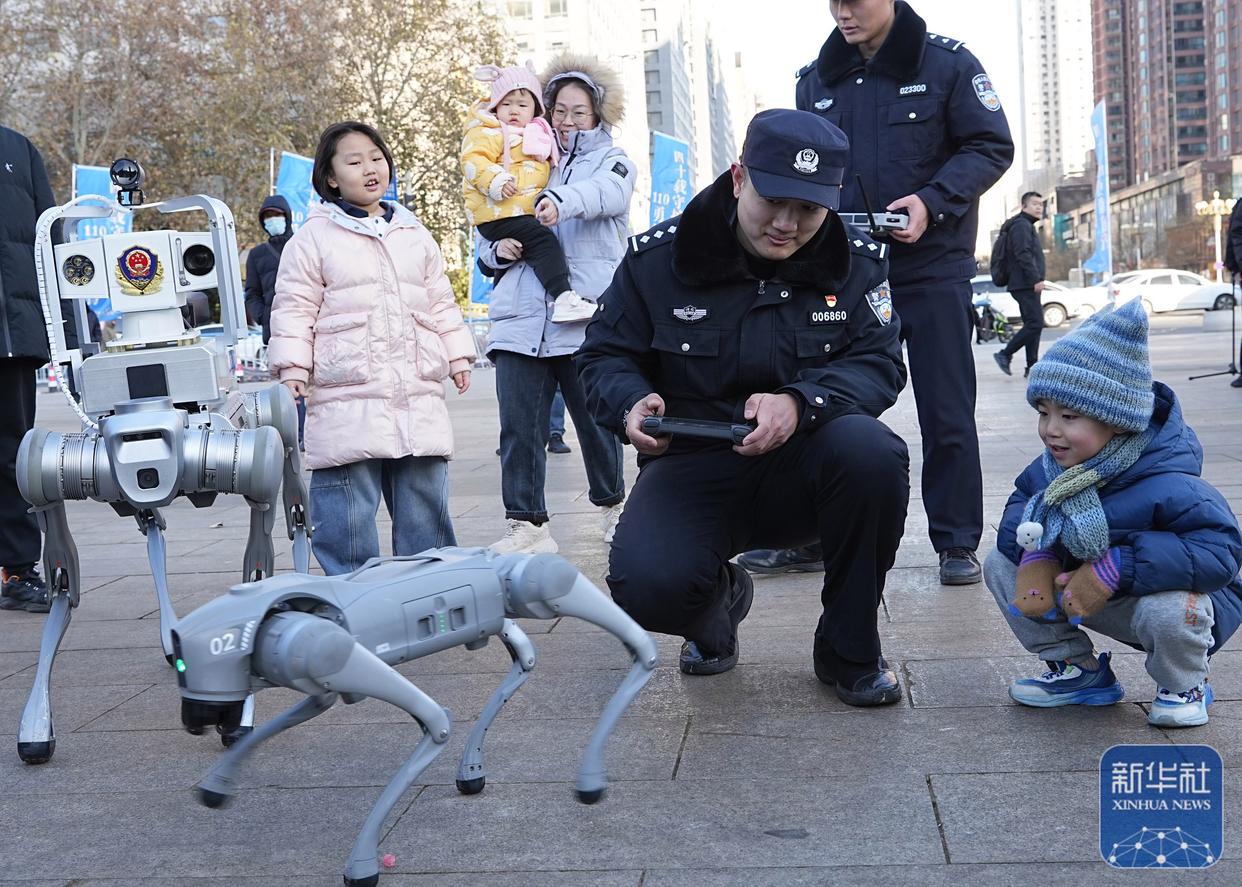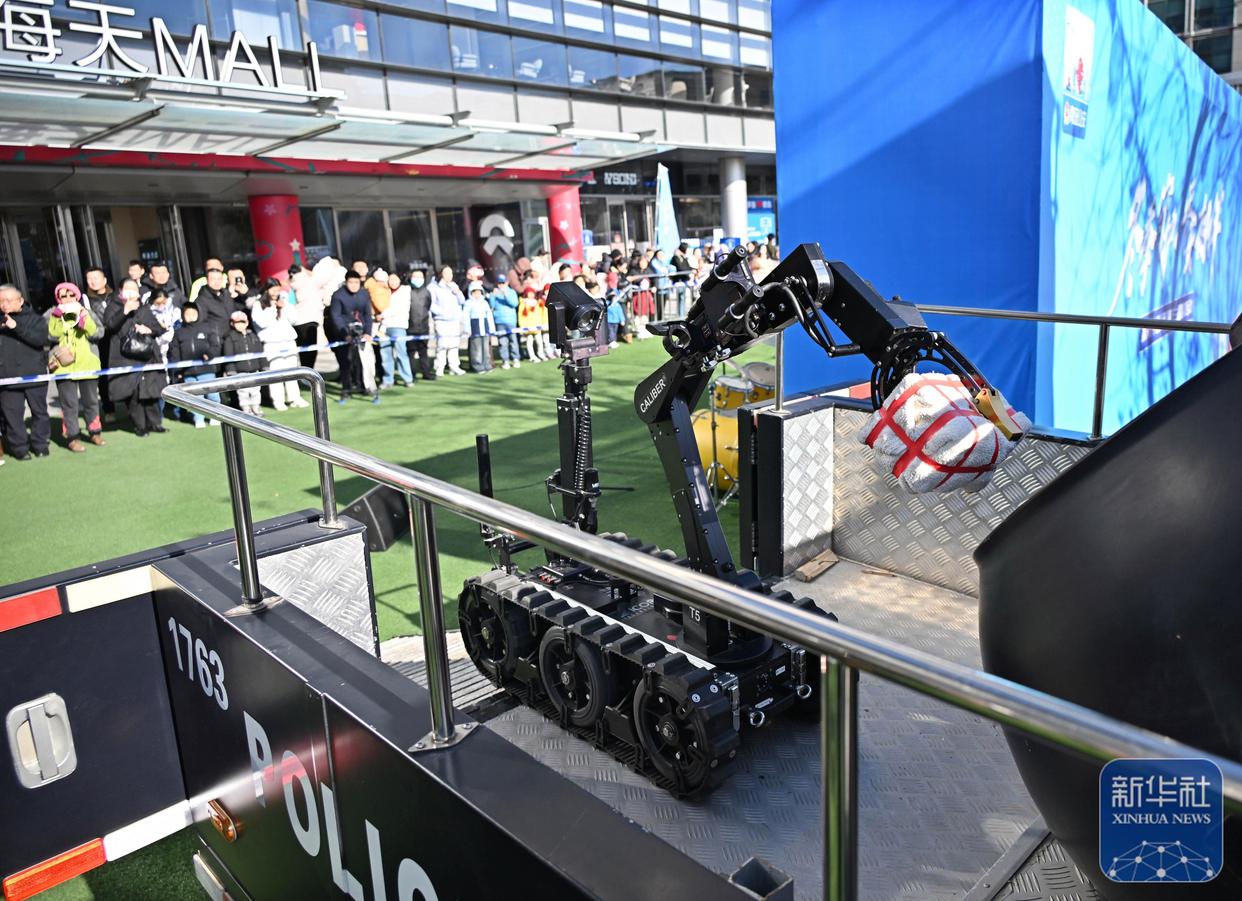 ↑ 1月10日,在山東省青島市舉行的“冬季守護(hù)·平安相伴”第六個中國人民警察節(jié)主題宣防活動中,市民觀看機(jī)器人排爆展示。新華社記者 李紫恒 攝