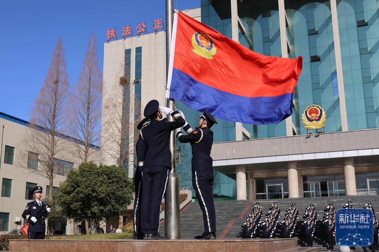 ↑ 1月10日,河南省沁陽市公安局舉行升旗儀式,慶祝第六個中國人民警察節(jié)。新華社發(fā)(張新雨攝)