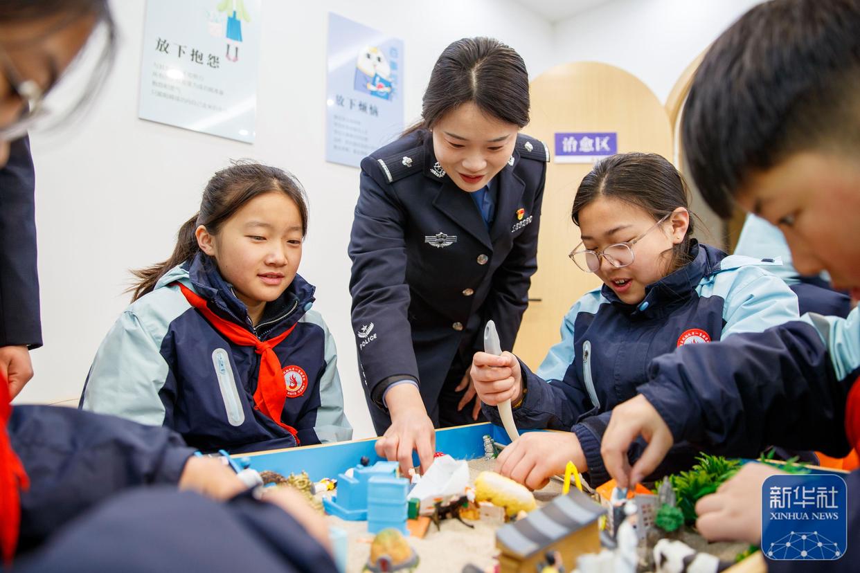 ↑ 1月10日,河南省商丘市睢縣公安局舉行警營開放日活動,小朋友在睢縣公安局心理健康服務(wù)站體驗沙盤游戲。新華社發(fā)(徐澤源攝)