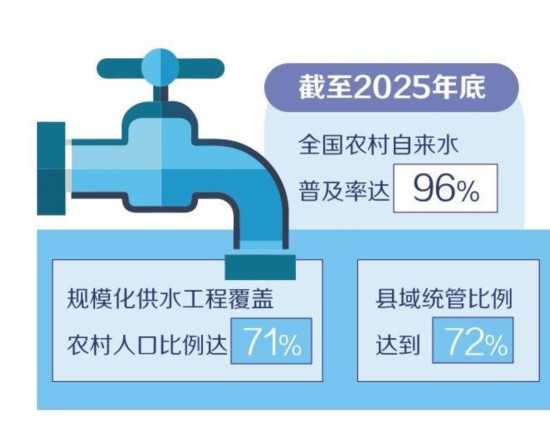 農(nóng)村供水事關(guān)億萬百姓的福祉。近年來,水利部門在充分調(diào)研和總結(jié)地方經(jīng)驗的基礎(chǔ)上,創(chuàng)新提出農(nóng)村供水“3+1”標(biāo)準(zhǔn)化建設(shè)和管護(hù)模式。“3”是指優(yōu)先推進(jìn)城鄉(xiāng)供水一體化建設(shè),大力推進(jìn)集中供水規(guī)?;ㄔO(shè),因地制宜實施小型供水工程規(guī)范化建設(shè)和改造;“1”是指積極推進(jìn)縣域統(tǒng)管和專業(yè)化管護(hù)。截至2025年底,全國農(nóng)村自來水普及率達(dá)96%,規(guī)模化供水工程覆蓋農(nóng)村人口比例達(dá)71%,縣域統(tǒng)管比例達(dá)到72%。