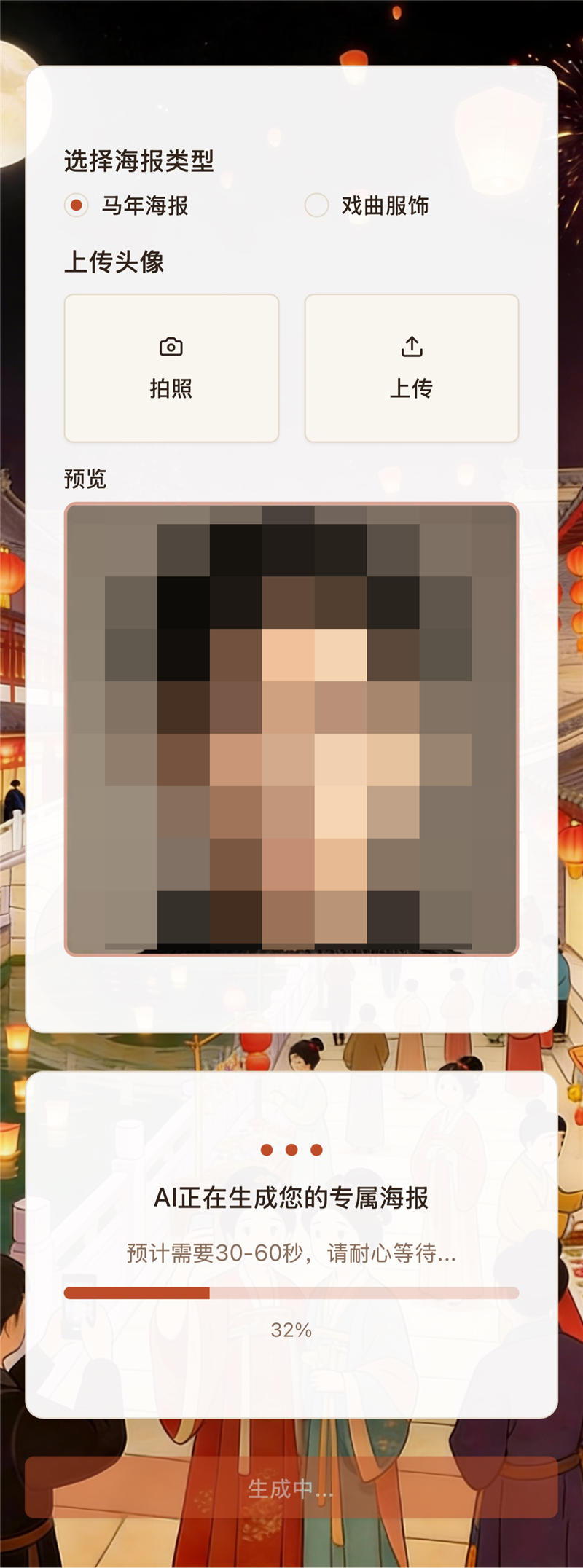 第三步:自拍或者上傳肖像照片、填寫昵稱,點(diǎn)擊“生成海報(bào)”,因?yàn)槭菍伲仟?dú)一無二的設(shè)計(jì),AI需要一點(diǎn)計(jì)算時(shí)間,請耐心等待。